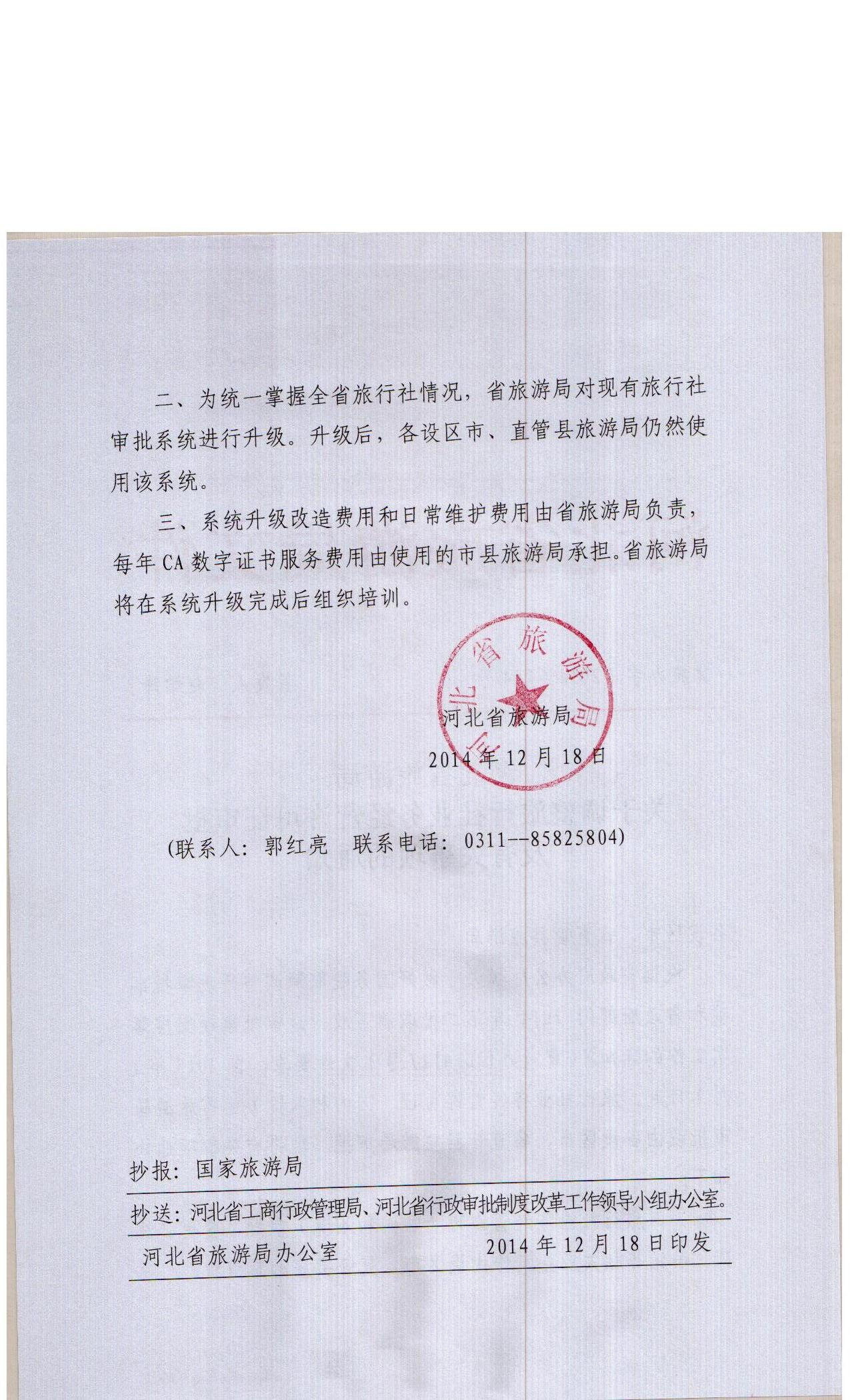 按照河北省旅游局《关于调整旅行社业务经营许可证审批及有关事项的通知》冀旅办[2014]154号文件要求,自2015年1月1日起,旅行社业务经营许可证(国内和入境)由省旅游局改由各社区市、省直县管旅游局审批