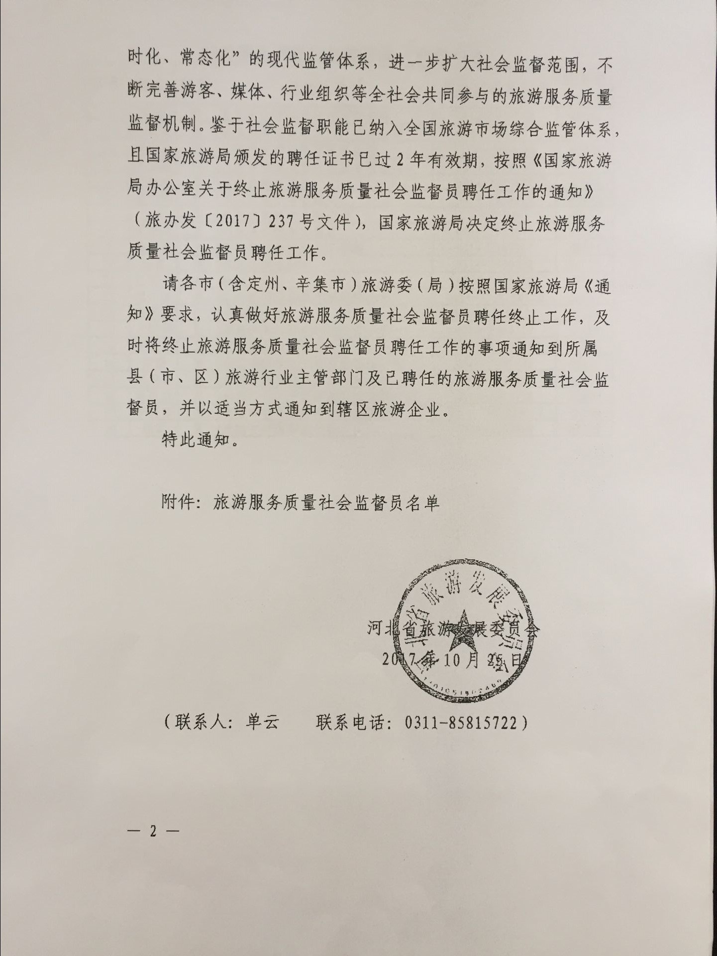 关于终止旅游服务质量社会监督员聘任工作的通知