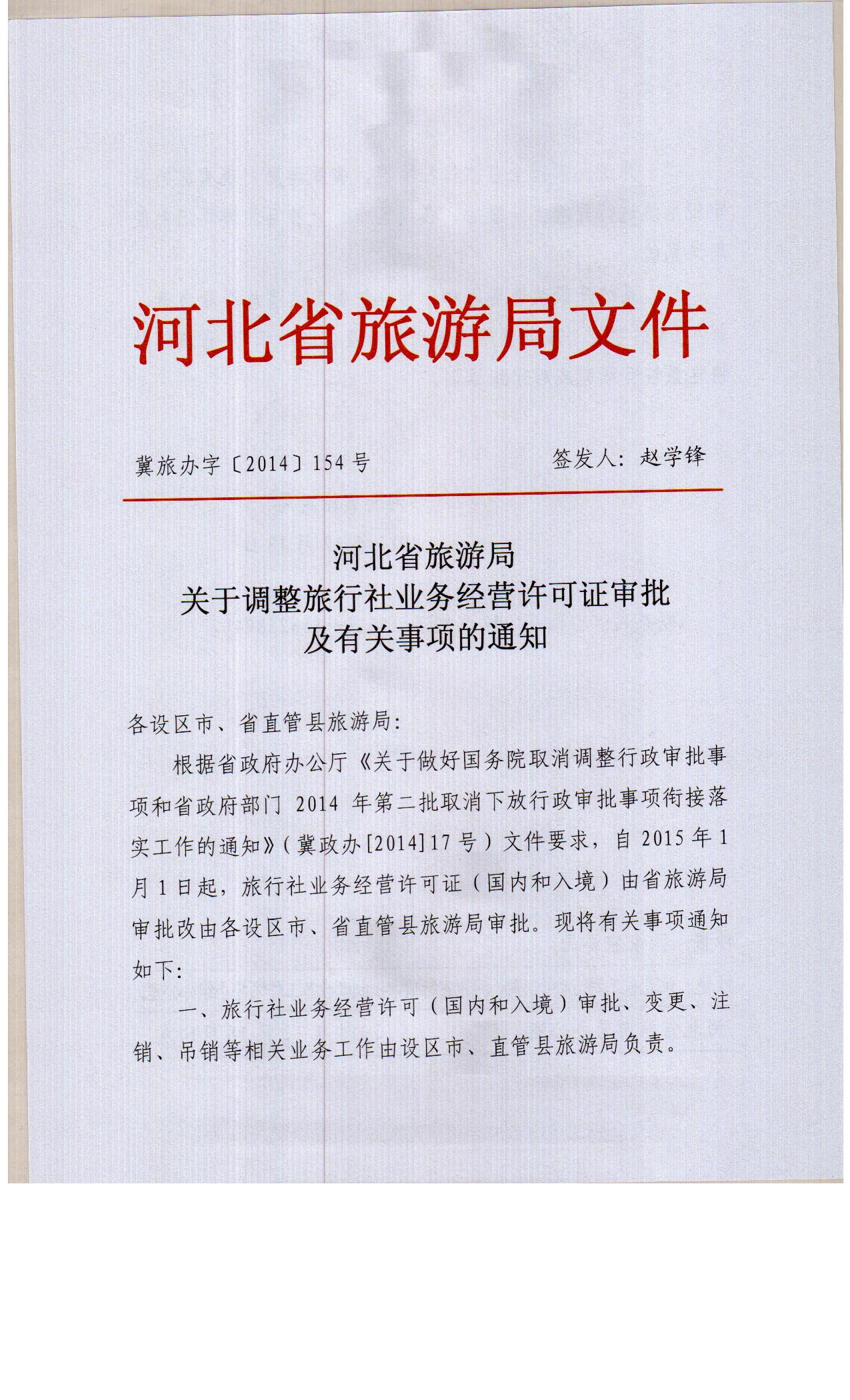 按照河北省旅游局《关于调整旅行社业务经营许可证审批及有关事项的通知》冀旅办[2014]154号文件要求,自2015年1月1日起,旅行社业务经营许可证(国内和入境)由省旅游局改由各社区市、省直县管旅游局审批
