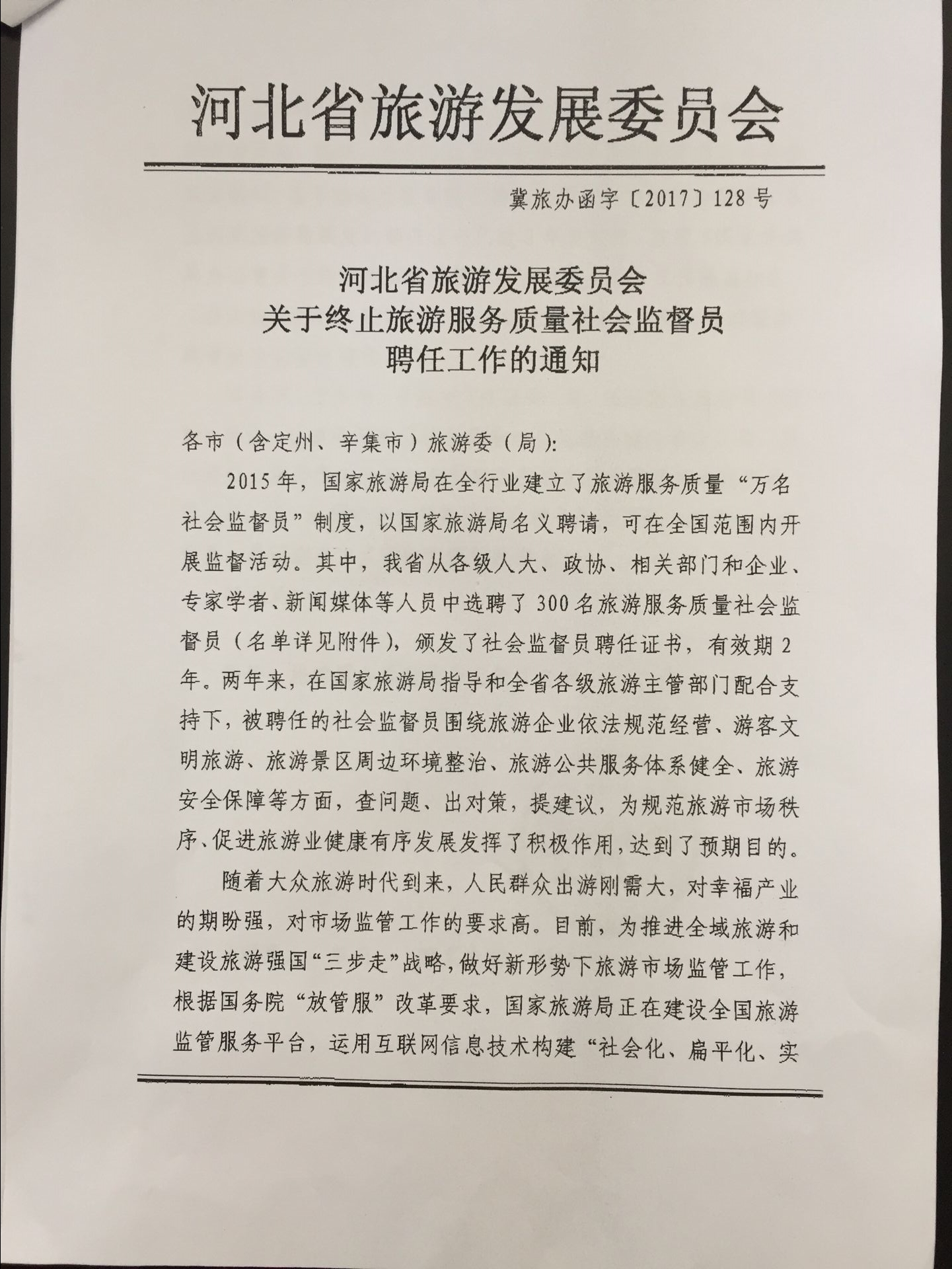 关于终止旅游服务质量社会监督员聘任工作的通知